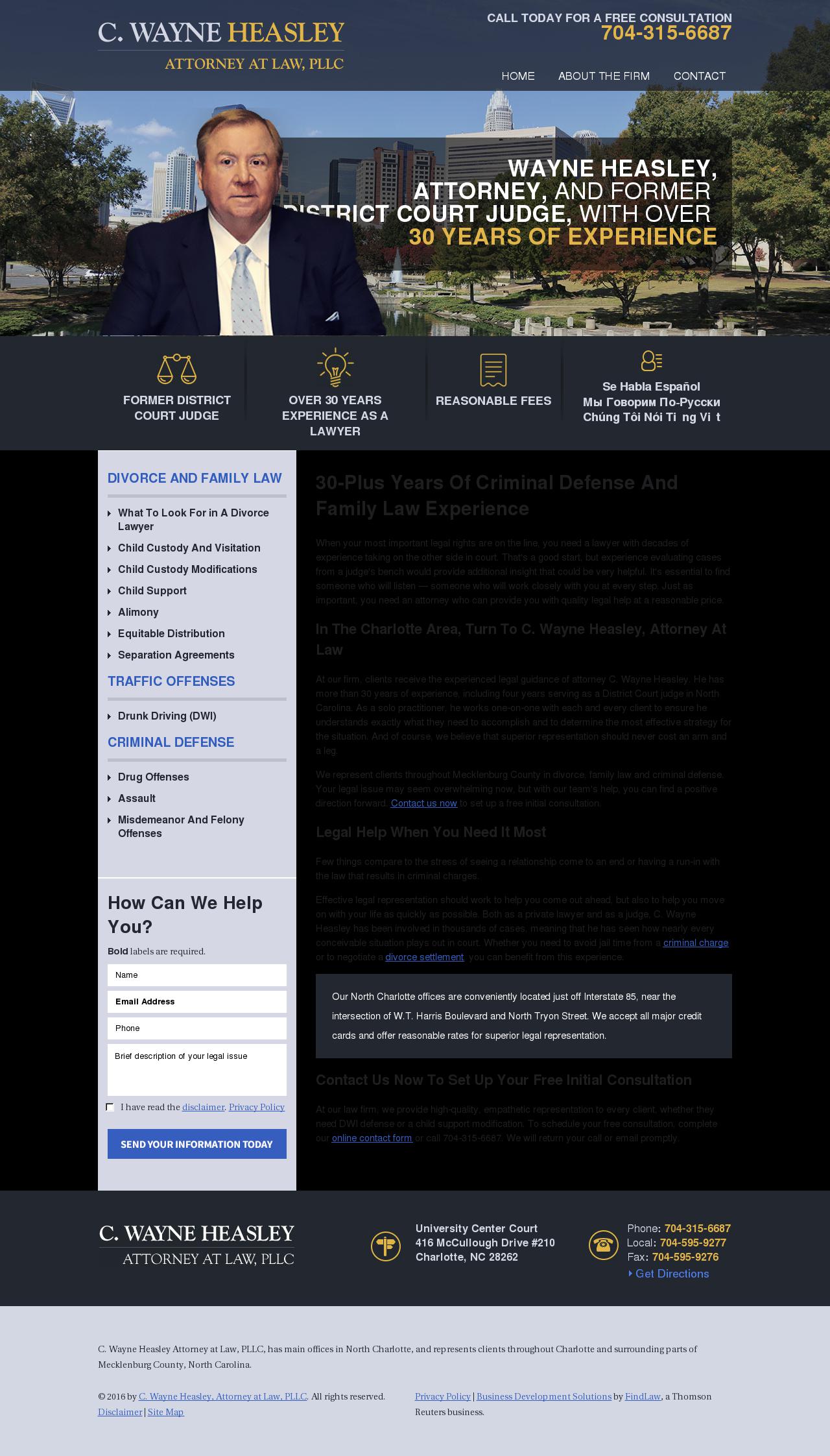 C. Wayne Heasley Attorney at Law, PLLC Family Law and Criminal Defense Lawyer in Charlotte NC C. Wayne Heasley Attorney at Law, PLLC, represents clients throughout Charlotte and Mecklenburg County. For a consultation, call 704-315-6687.