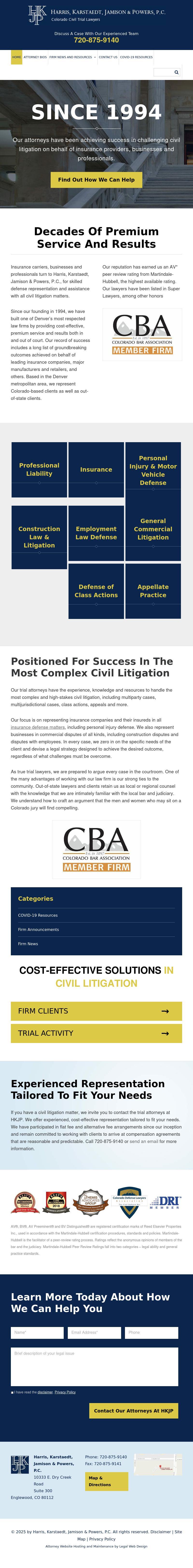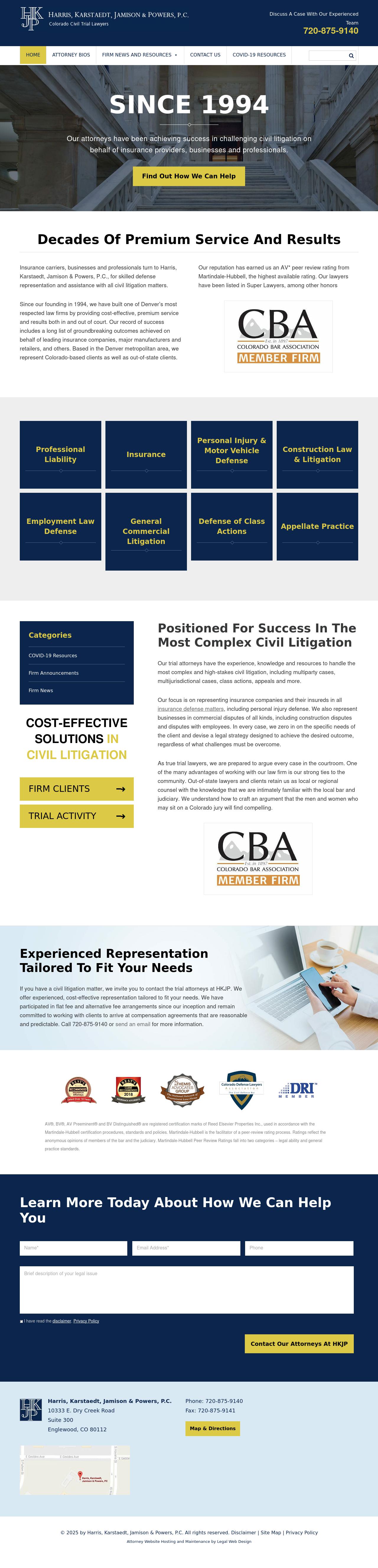 Harris, Karstaedt, Jamison & Powers, P.C. Civil Litigation Attorney Denver | Insurance Lawyer Springs | Englewood Personal Injury Law Firm Denver - Springs Civil Litigation Attorneys - Harris, Karstaedt, Jamison & Powers, P.C. With offices in Denver (Englewood) and Springs, the trial attorneys provide sophisticated legal representation to businesses, insurance carriers, and individuals throughout the Denver- Springs area. Our attorneys have earned their reputation as result-oriented trial attorneys and their track record of success.
