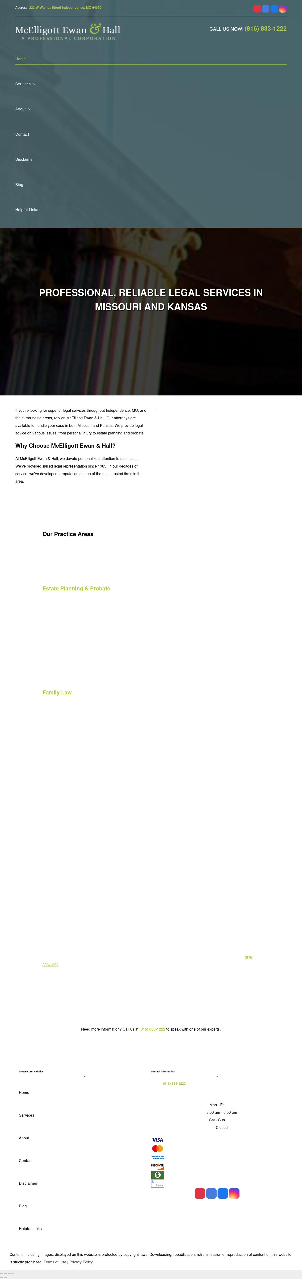 McElligott, Ewan, Hall & Kimminau Independence Missouri Estate Planning Lawyers | Kansas City Divorce Attorney Blue Springs Harrisonville Raymore MO Belton For a dedicated and experienced family law attorney in Independence, MO, call McElligott, Ewan, Hall & Kimminau, P.C., and schedule a consultation with one of the firm’s attorneys. Call 816-833-1222.